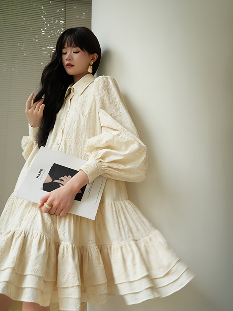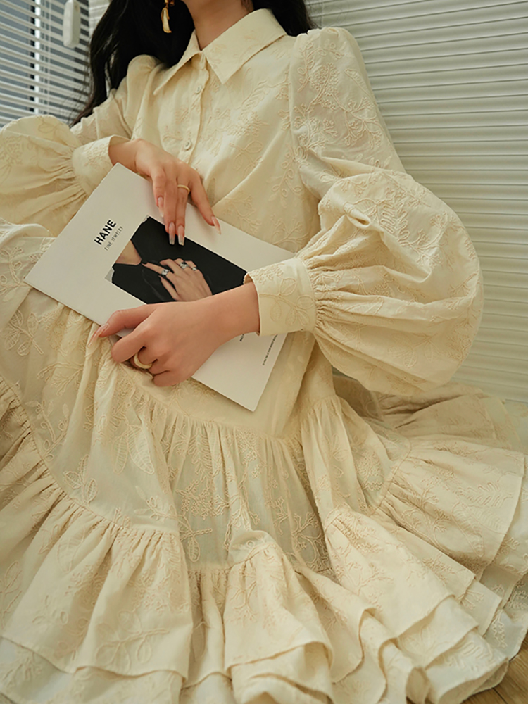 Aconiconi Puff Sleeve Embroidered Shirt Dress