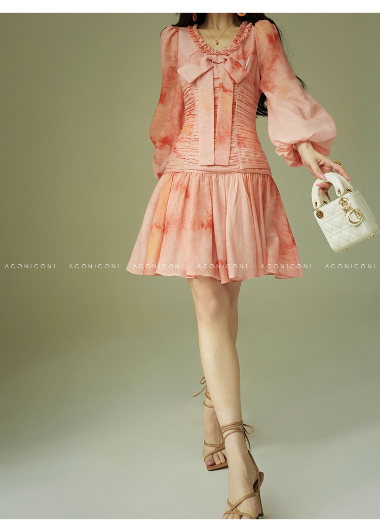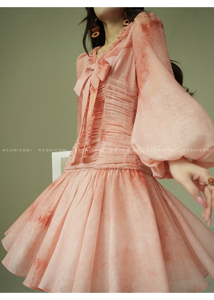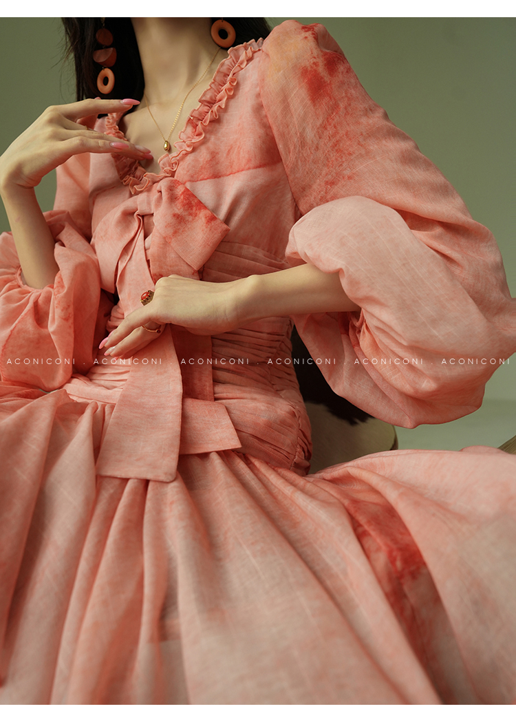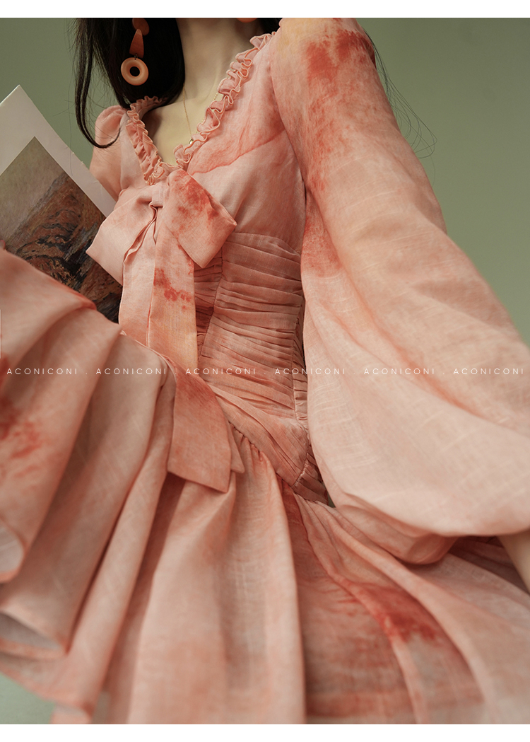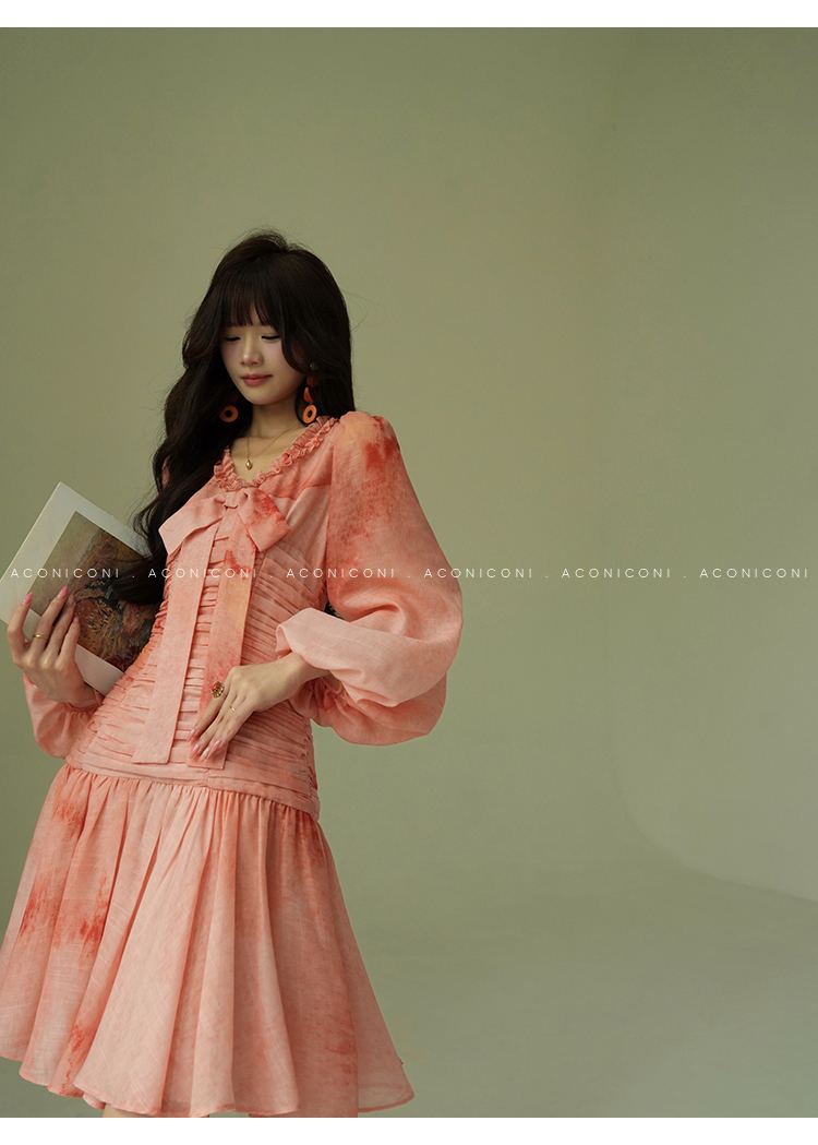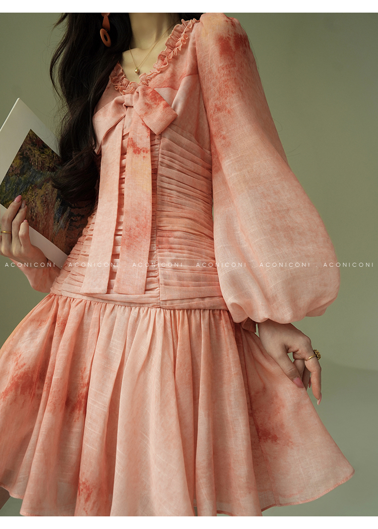 Aconiconi V-Neck Blended Print Long Sleeve Dress