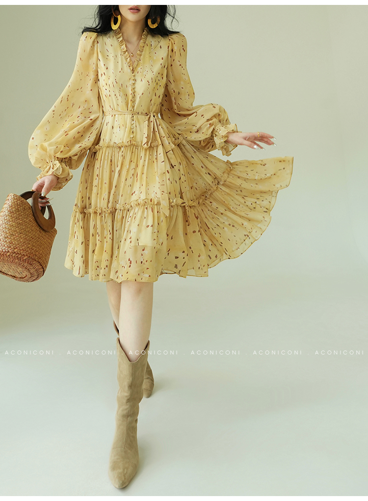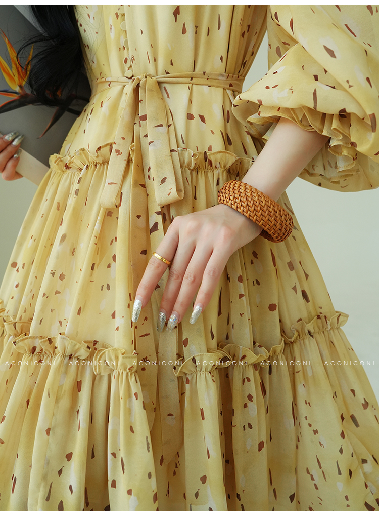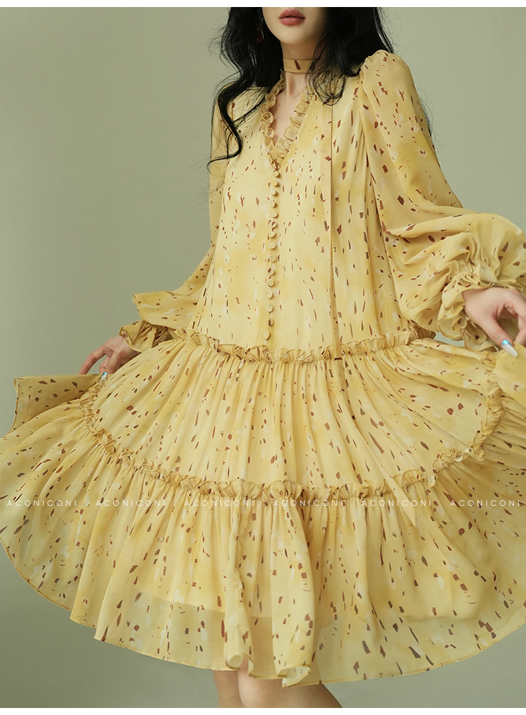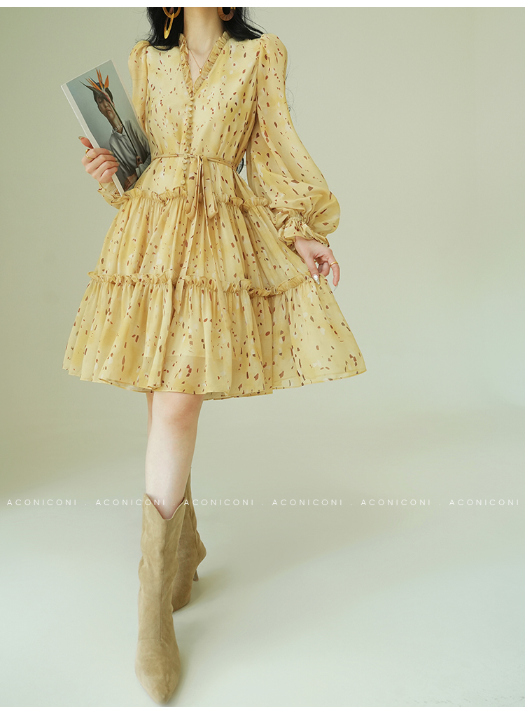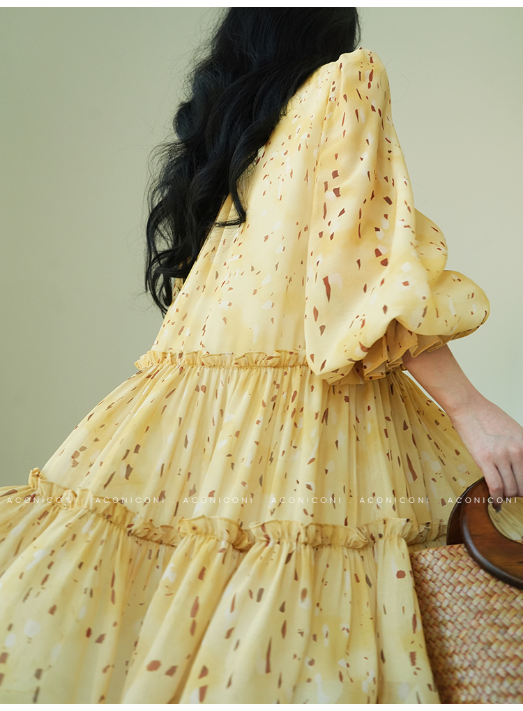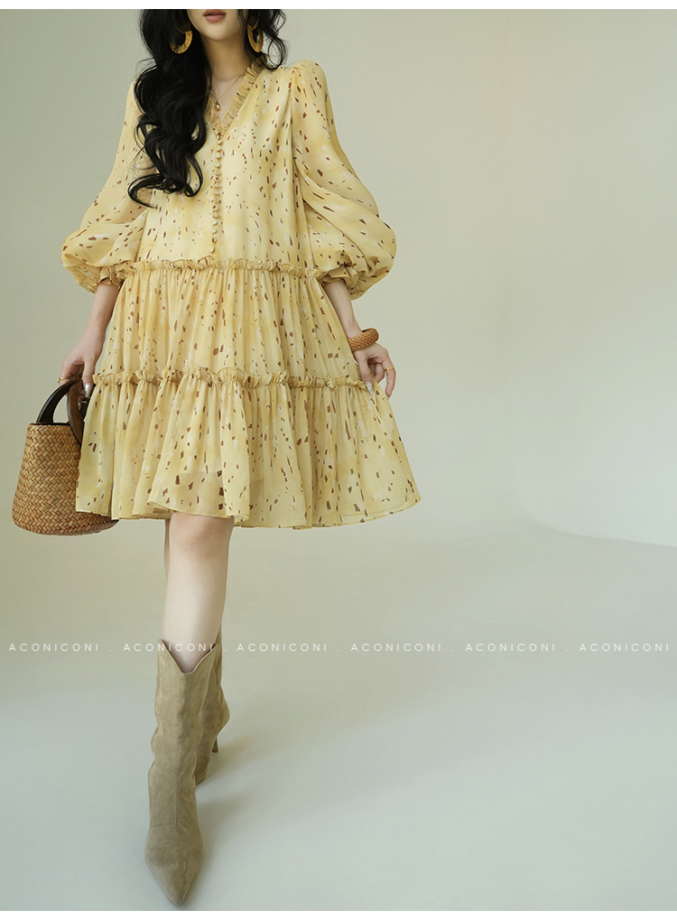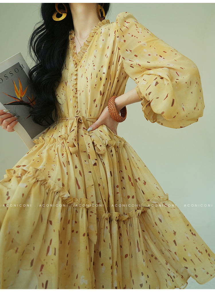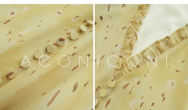 Aconiconi V-Neck Yellow Resort Style Short Dress