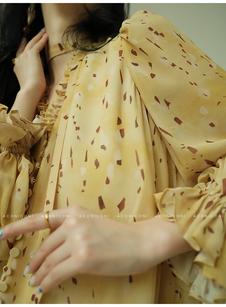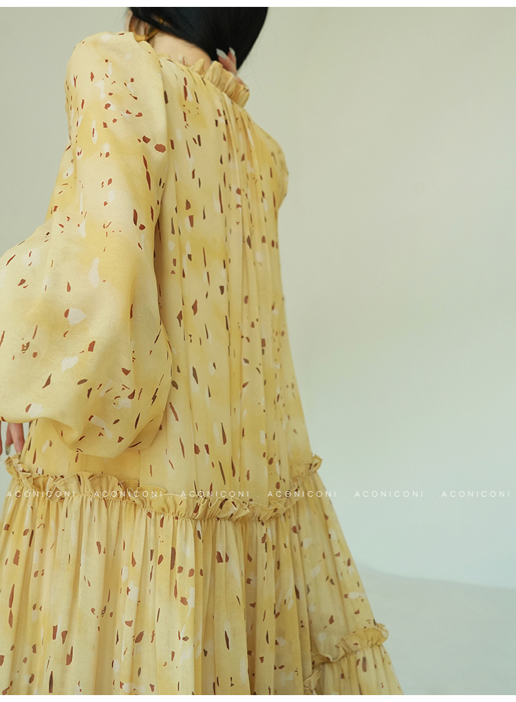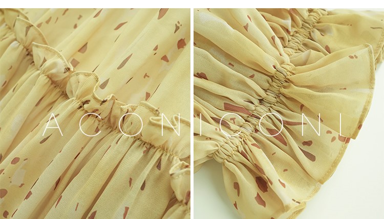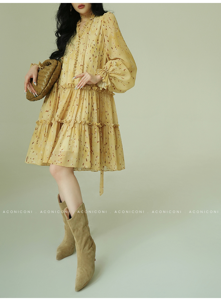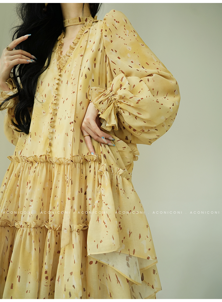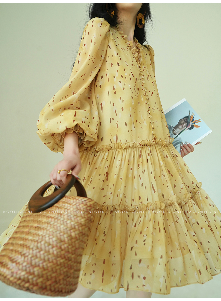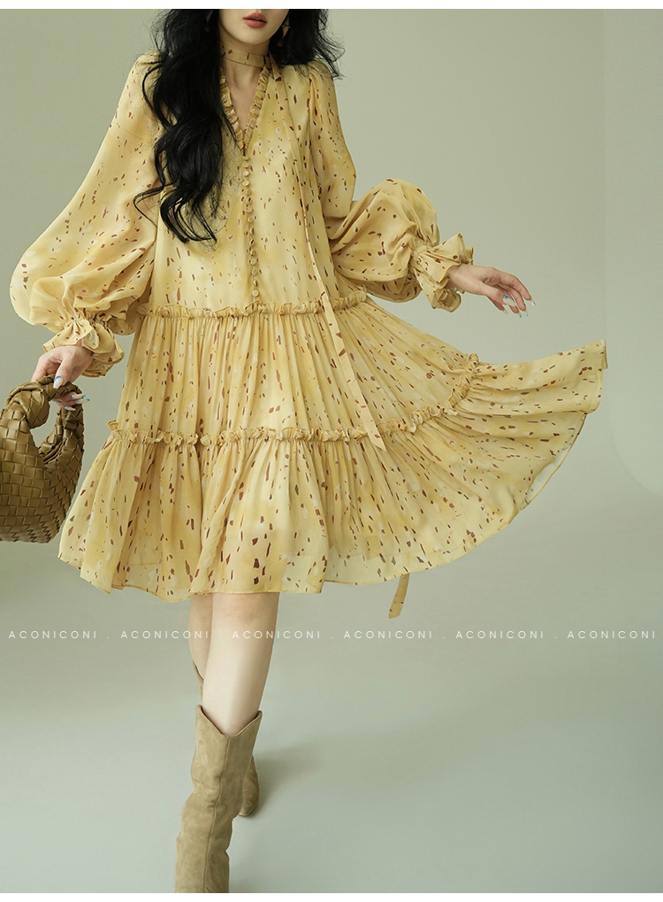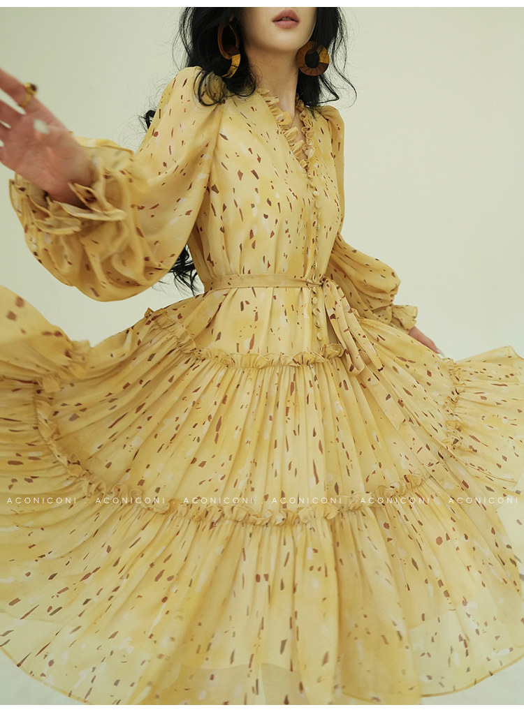 Aconiconi V-Neck Yellow Resort Style Short Dress