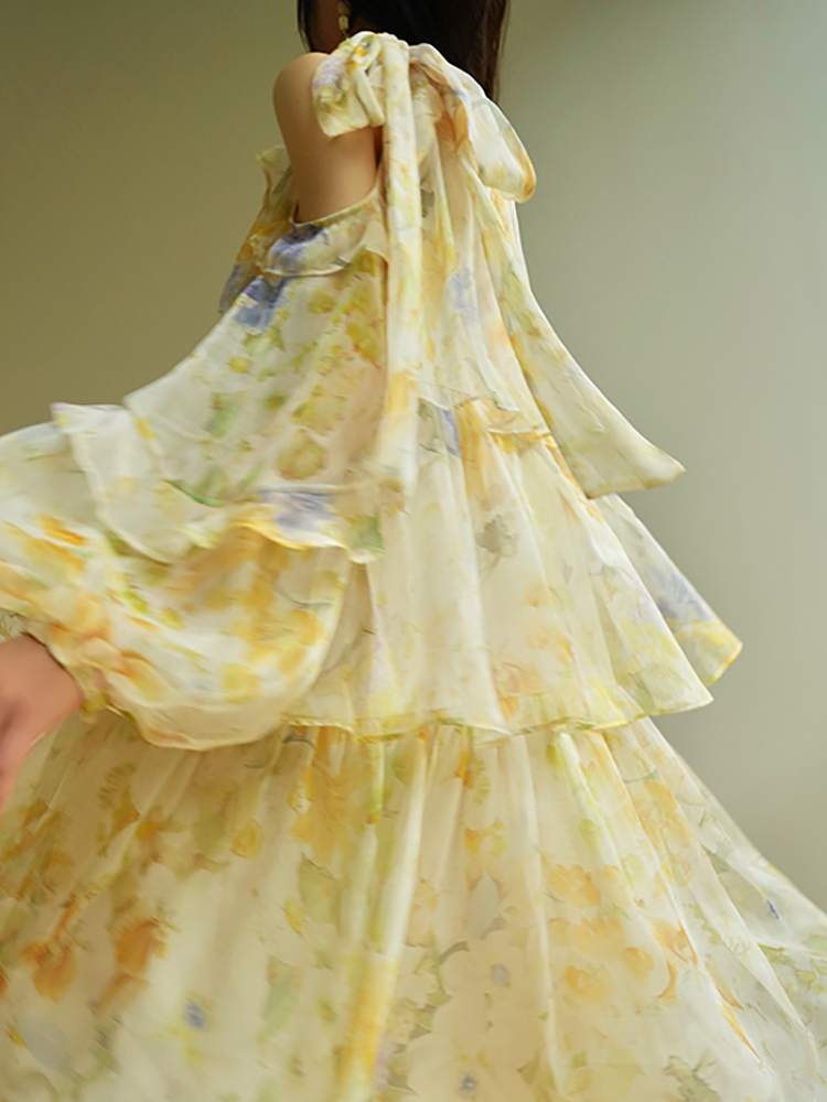 Aconiconi Yellow Floral Off Shoulder Ruffled Dress