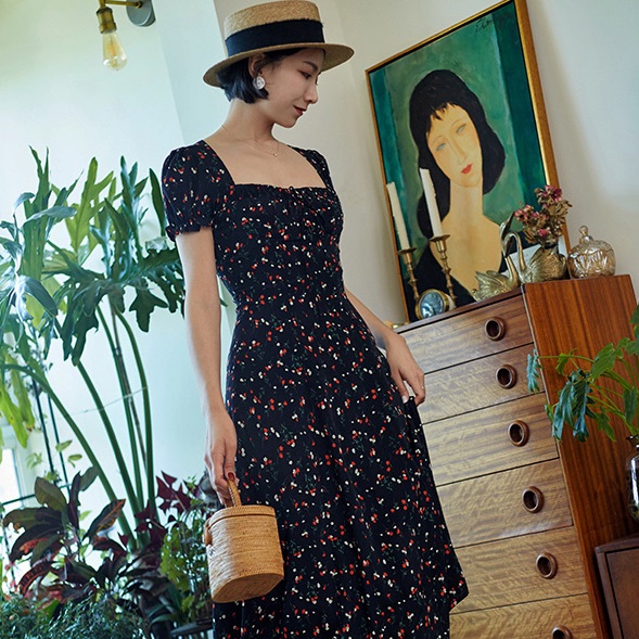 Ching's Closet Floral Square Neck Backless Puff Sleeve Dress