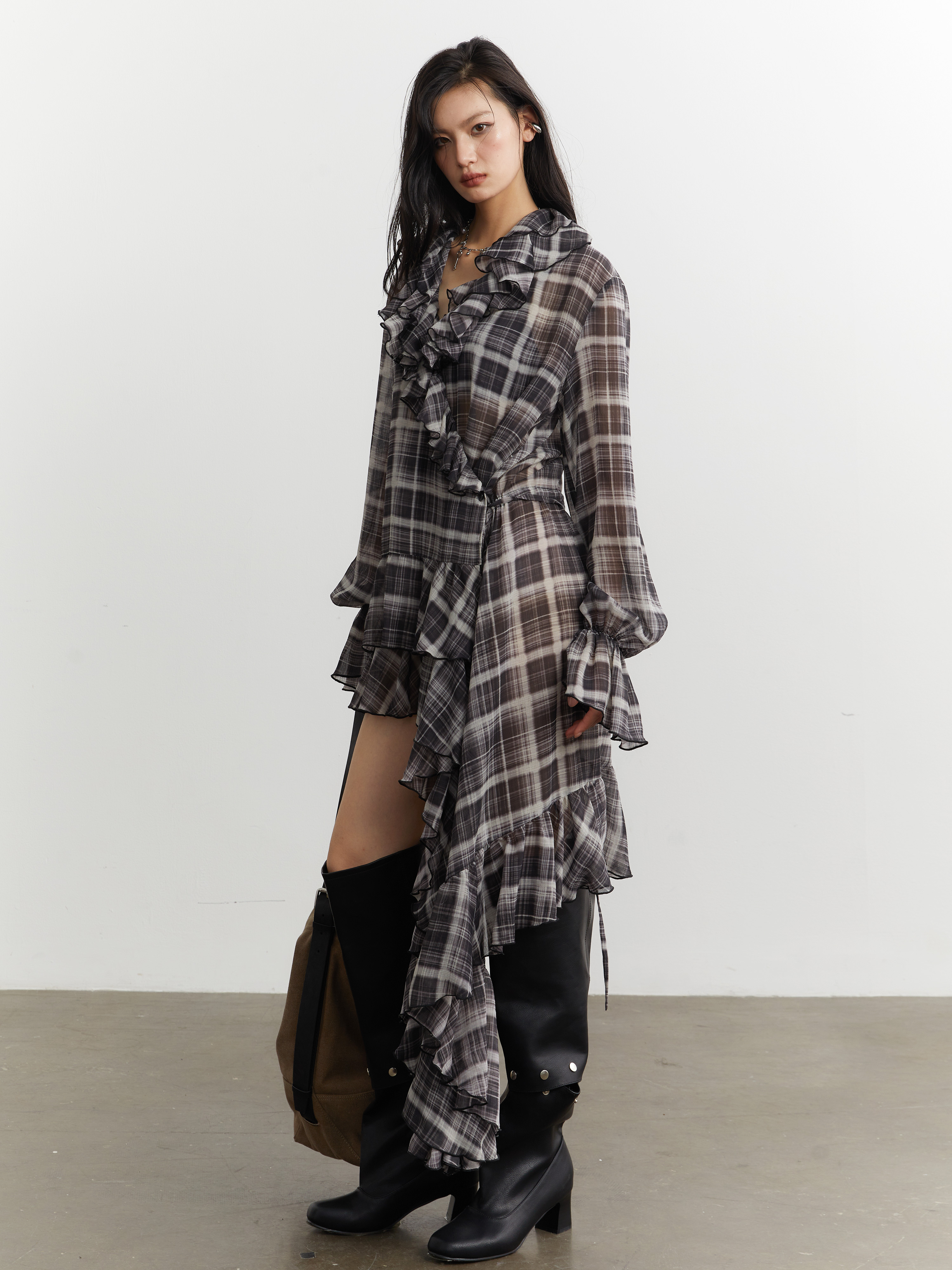 JNYLON Asymmetrical Ruffled Plaid Shirt Dress