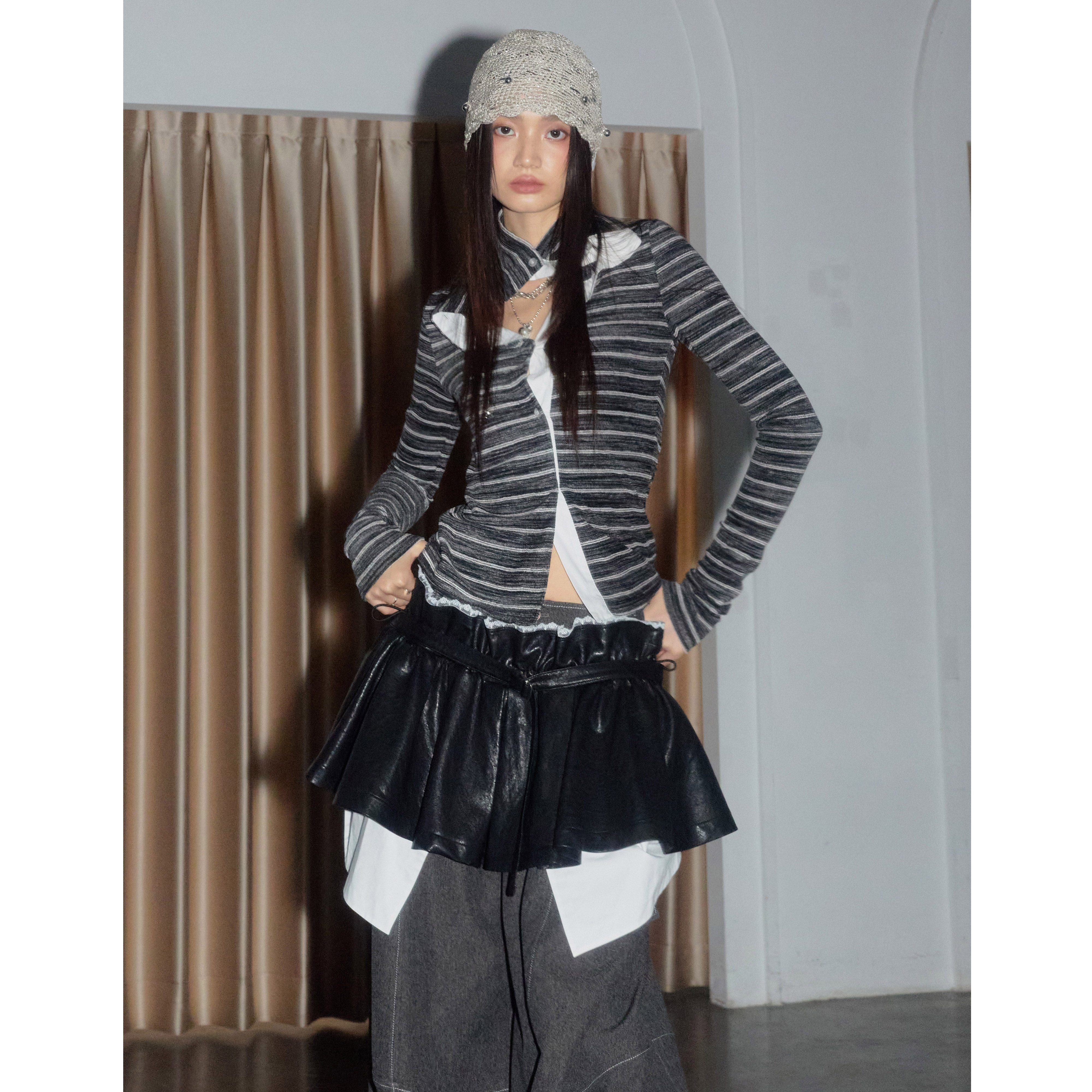 JNYLON Black Fake 2Piece Leather Puffy Skirt