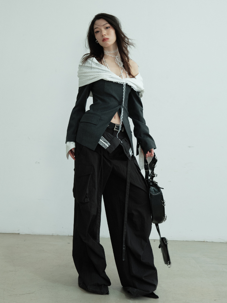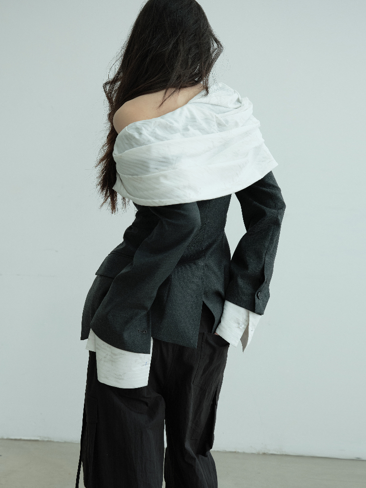JNYLON Off Shoulder Fake Two-Piece Contrast Blazer