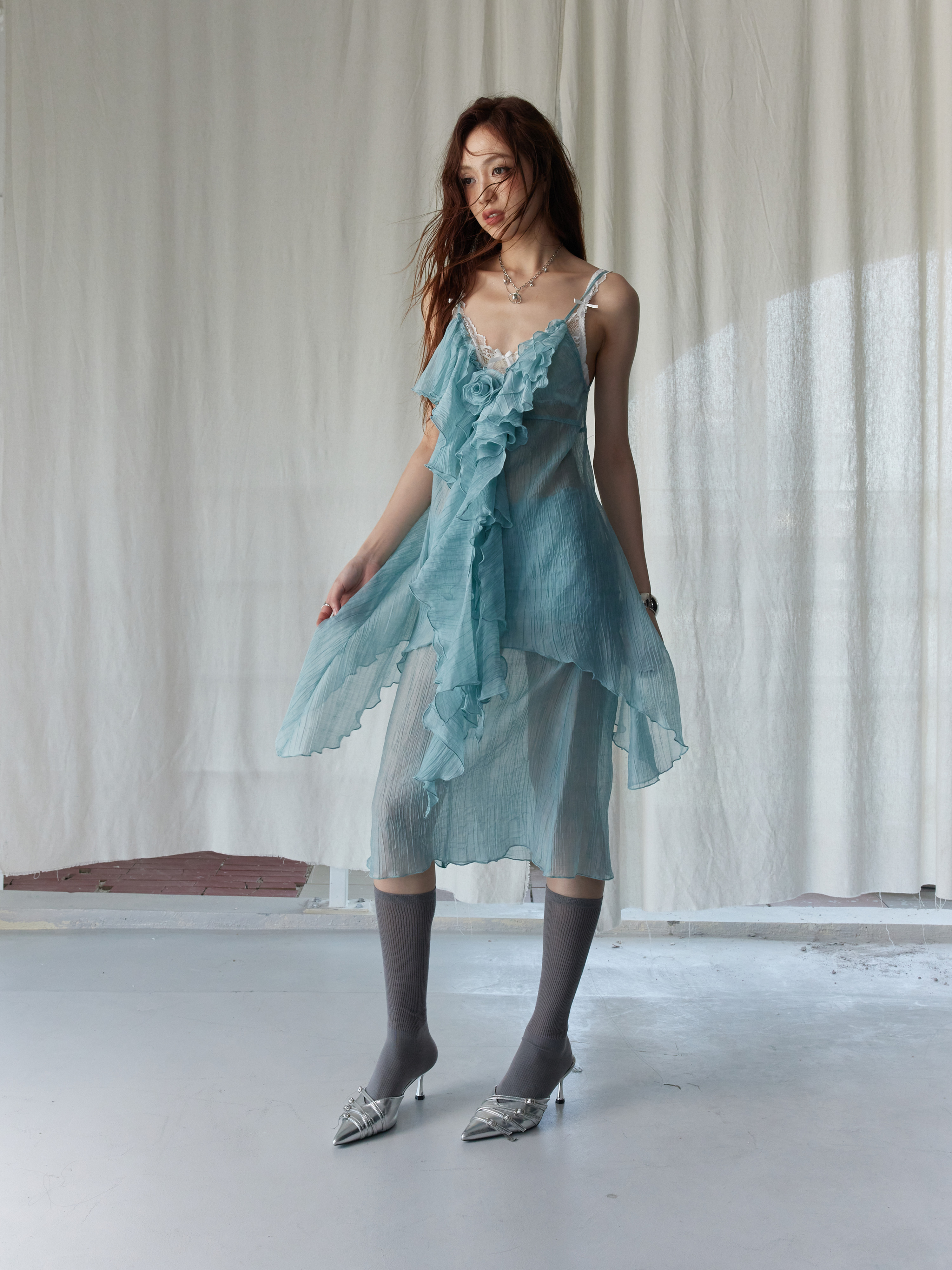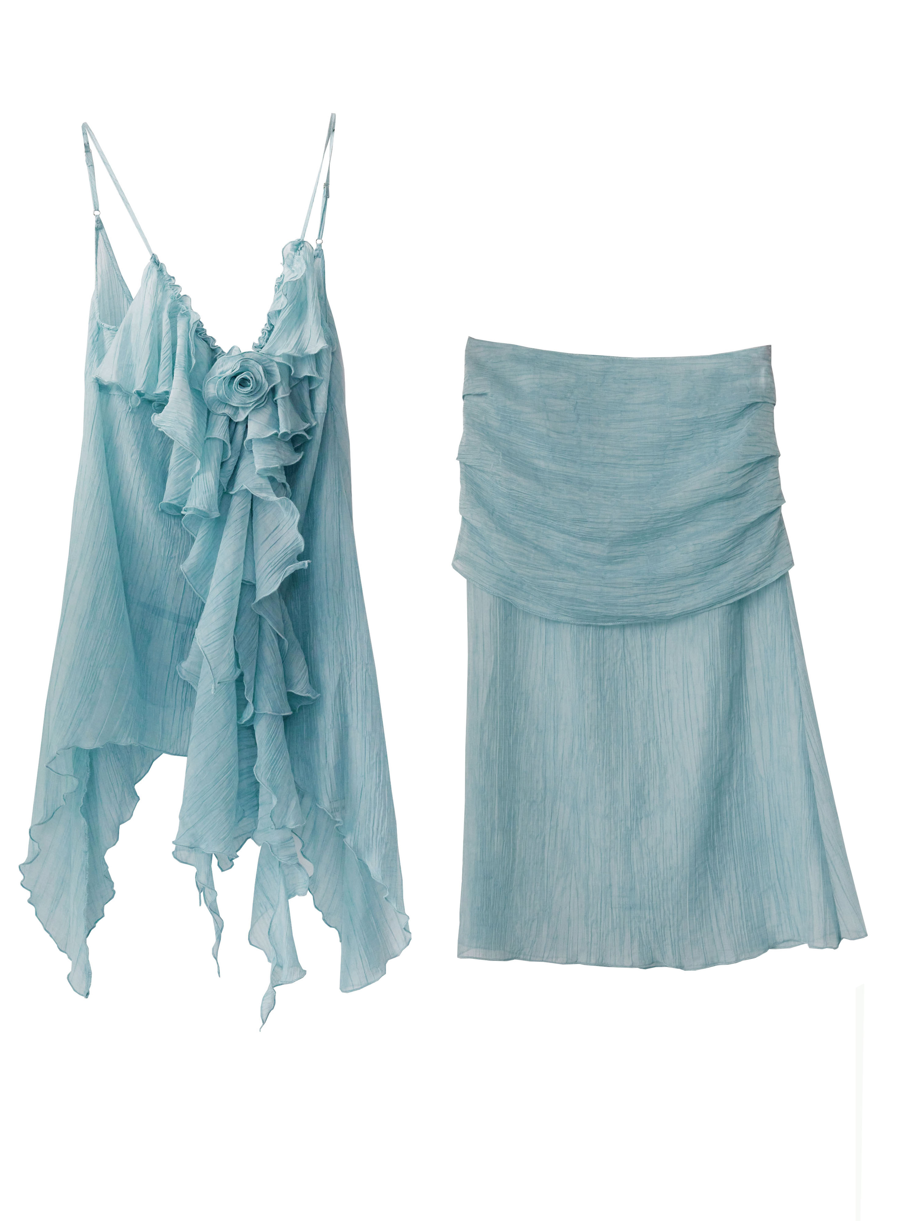 JNYLON V-Neck Blue Ruffled 2Piece Skirt Set