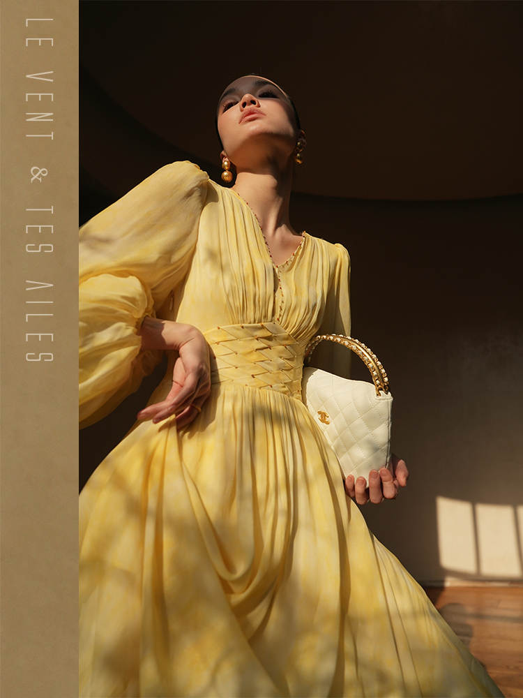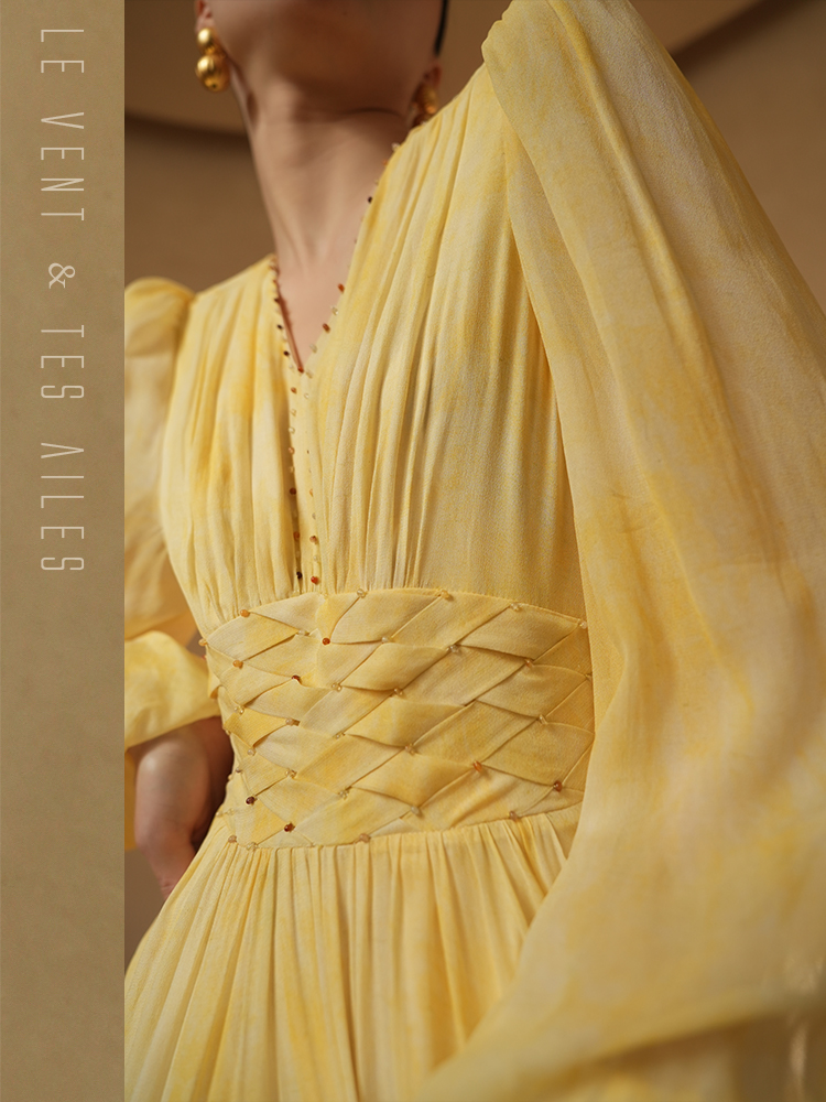 LE VENT&TES AILES Yellow V-Neck Puff Sleeve Maxi Dress