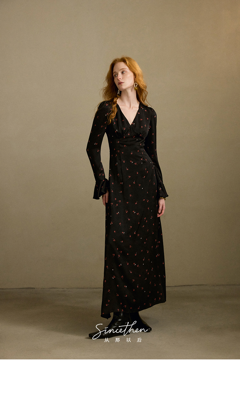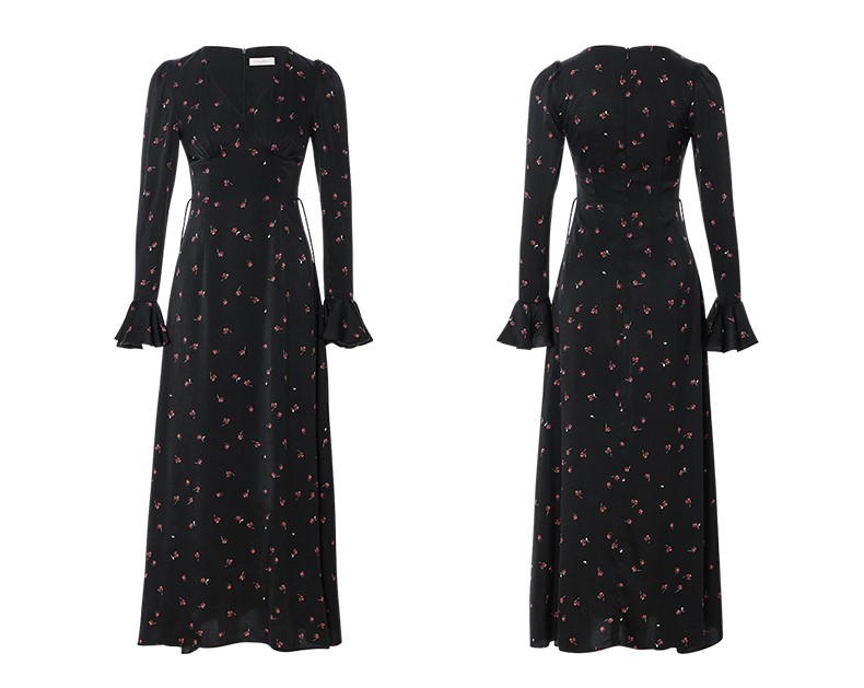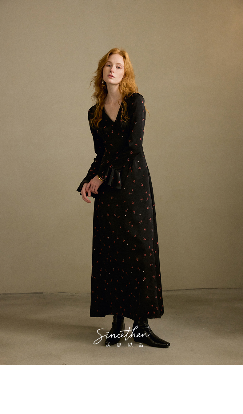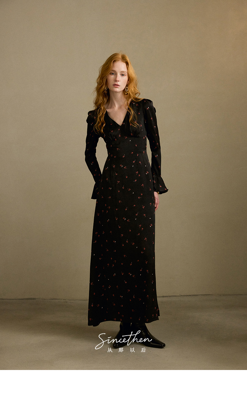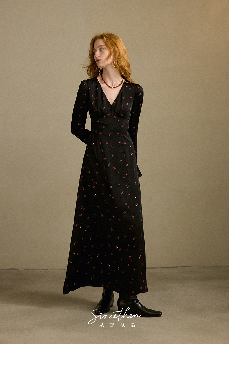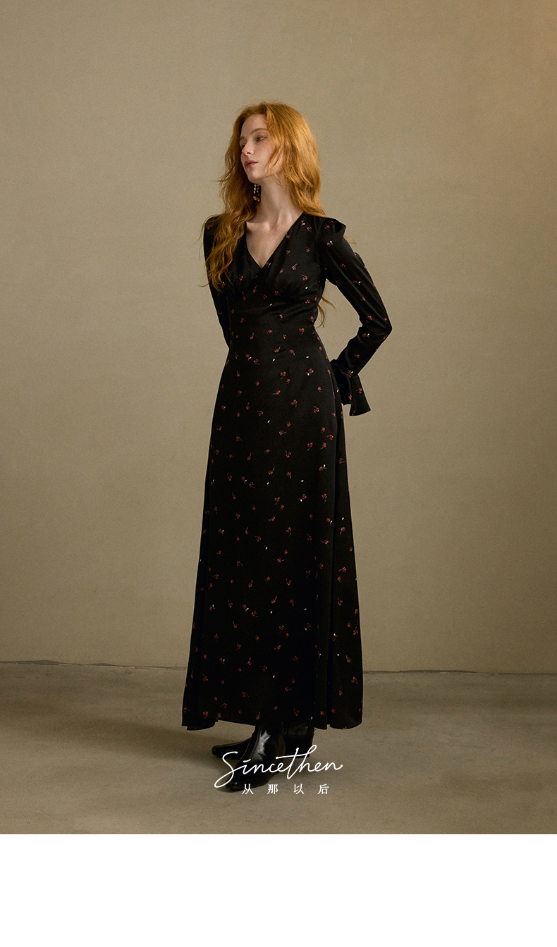 ST V-Neck Black Floral Long Dress