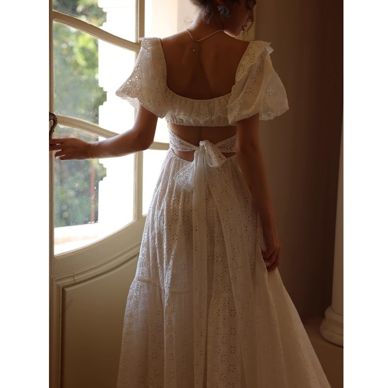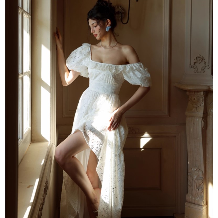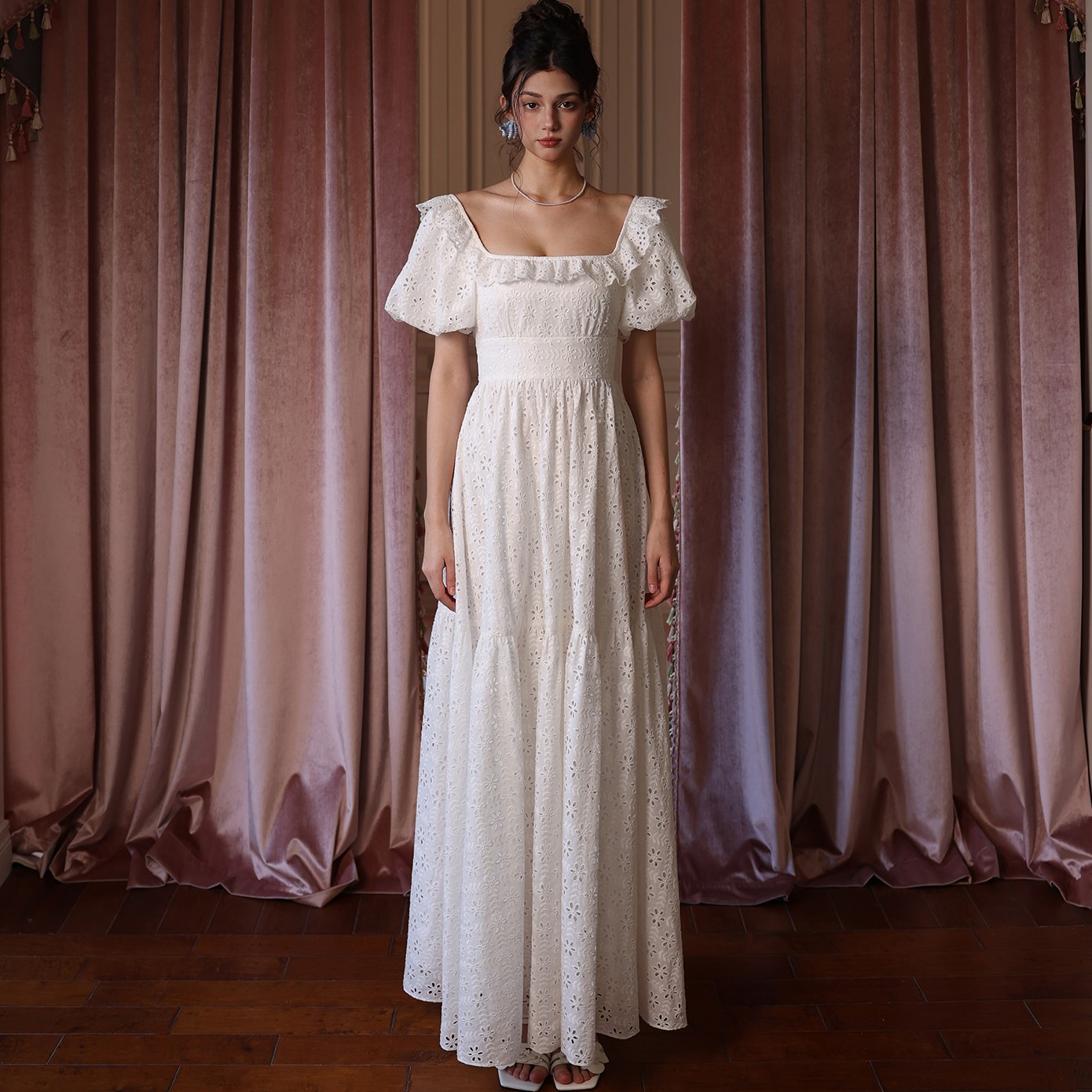 XIAOLI A-Line White Puff Sleeve Long Dress