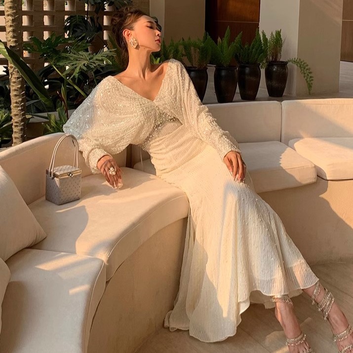 XIAOLI White Deep V-Neck Fishtail Elegant Dress