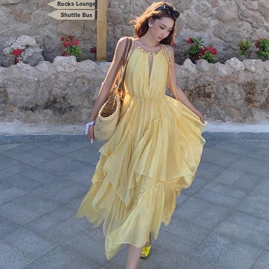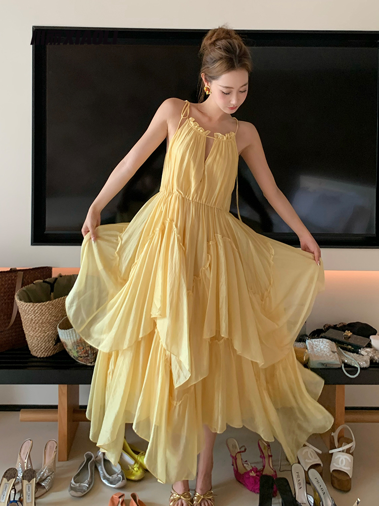XIAOLI Yellow Halterneck Long Fairy Dress